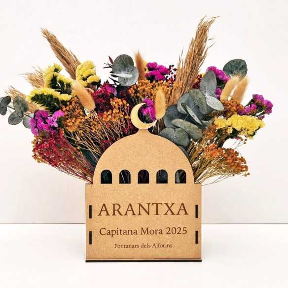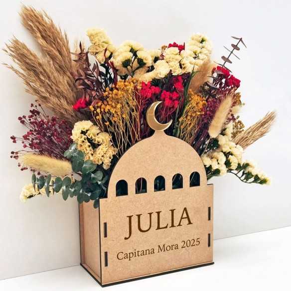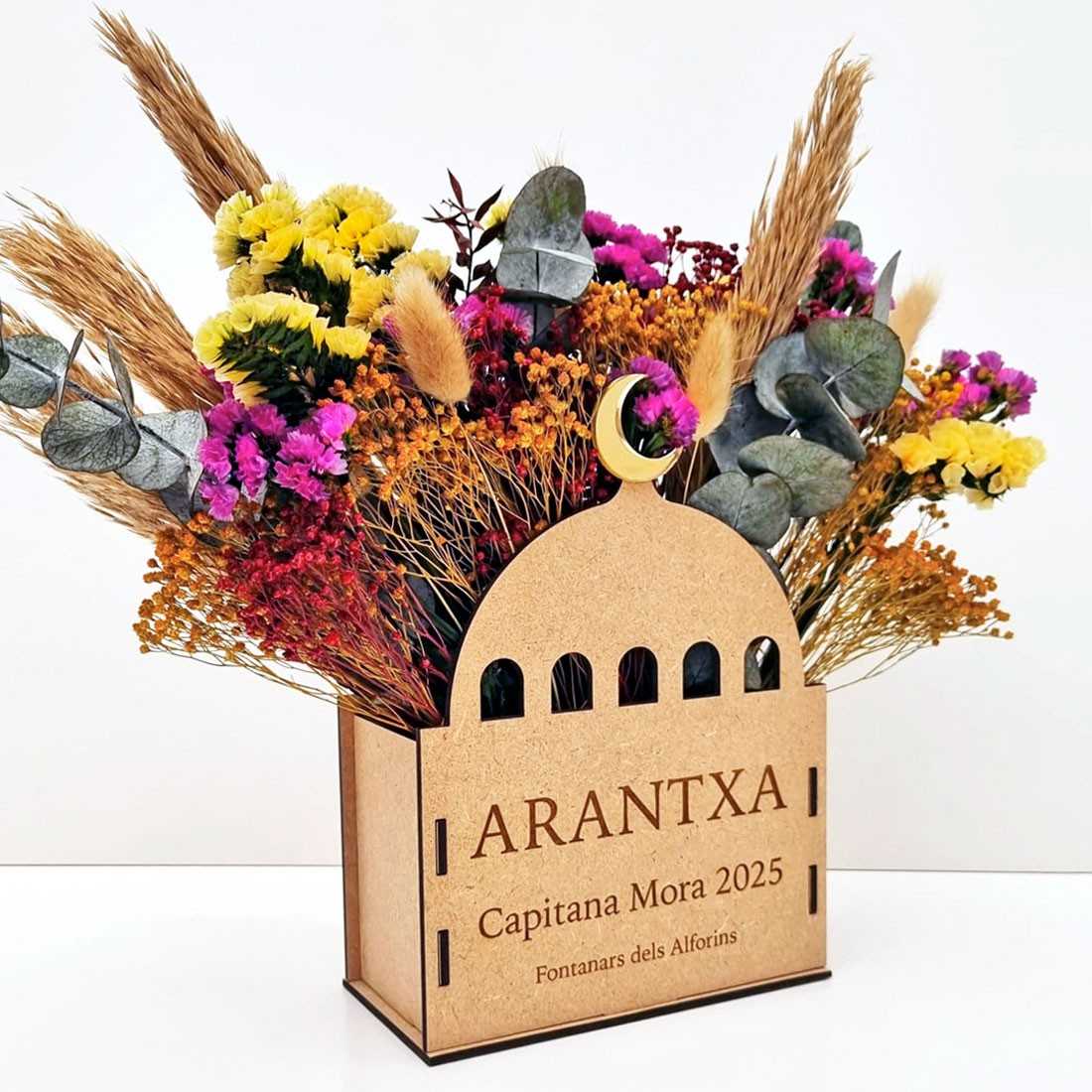 Caja con forma de castillo con cúpula mora personalizada para representantes de comparsa mora. Un regalo para Moros y Cristianos original, perfecto para sorprender. Incluye ramo de flores preservado con opción de elegir la tonalidad de flores de preferencia.