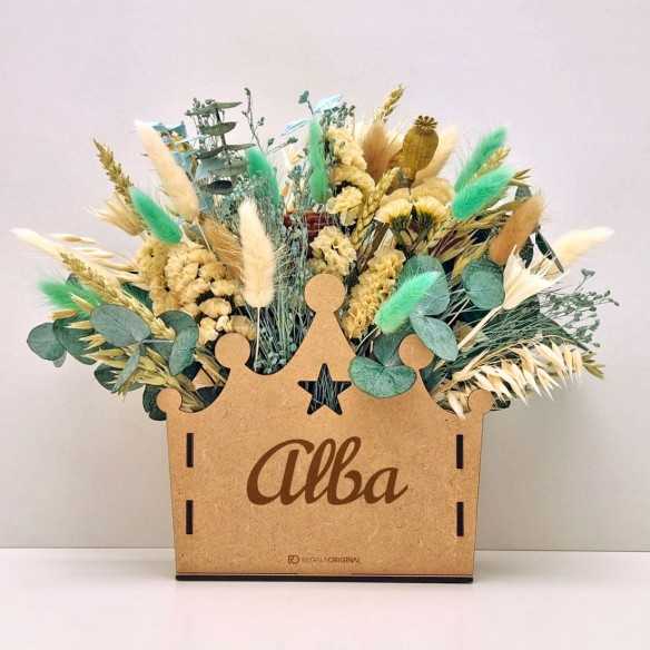 Caja corona estrella de madera personalizada con flores preservadas, un regalo para la bienvenida del bebé ideal para celebraciones infantiles (nacimiento, baby shower, gender reveal, cumpleaños, bautizo, etc.). Indícanos la tonalidad de flores que más te guste para confeccionar el ramo perfecto. Hecho con amor y pensado para durar.