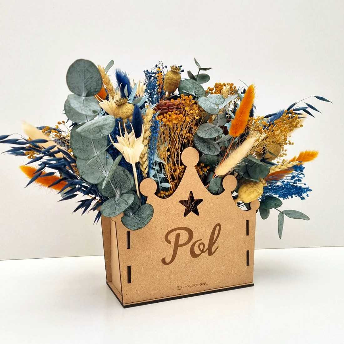 Incluye ramo de flores en seco y preservado.